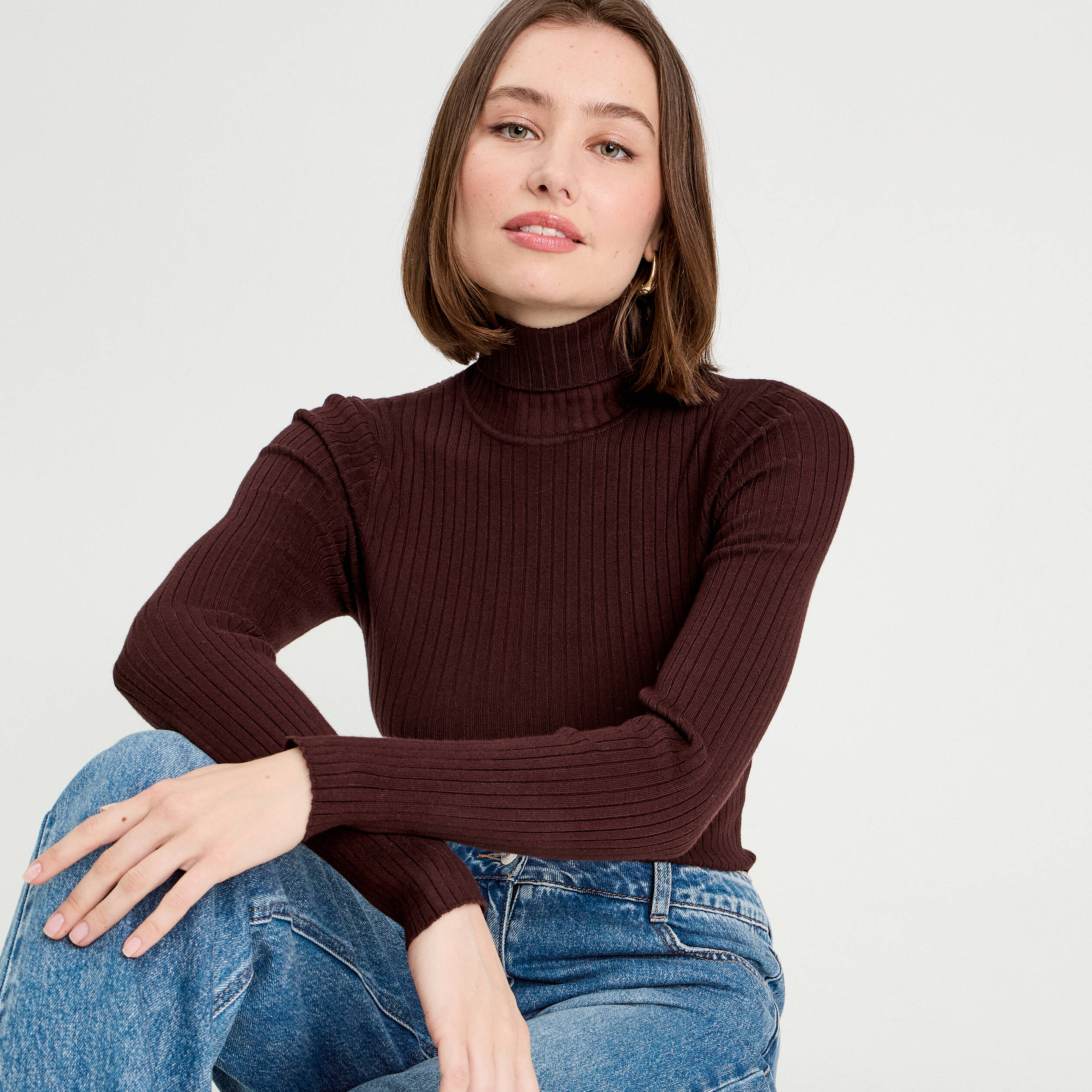 Pull côtelé col roulé marron foncé femme | Vibs