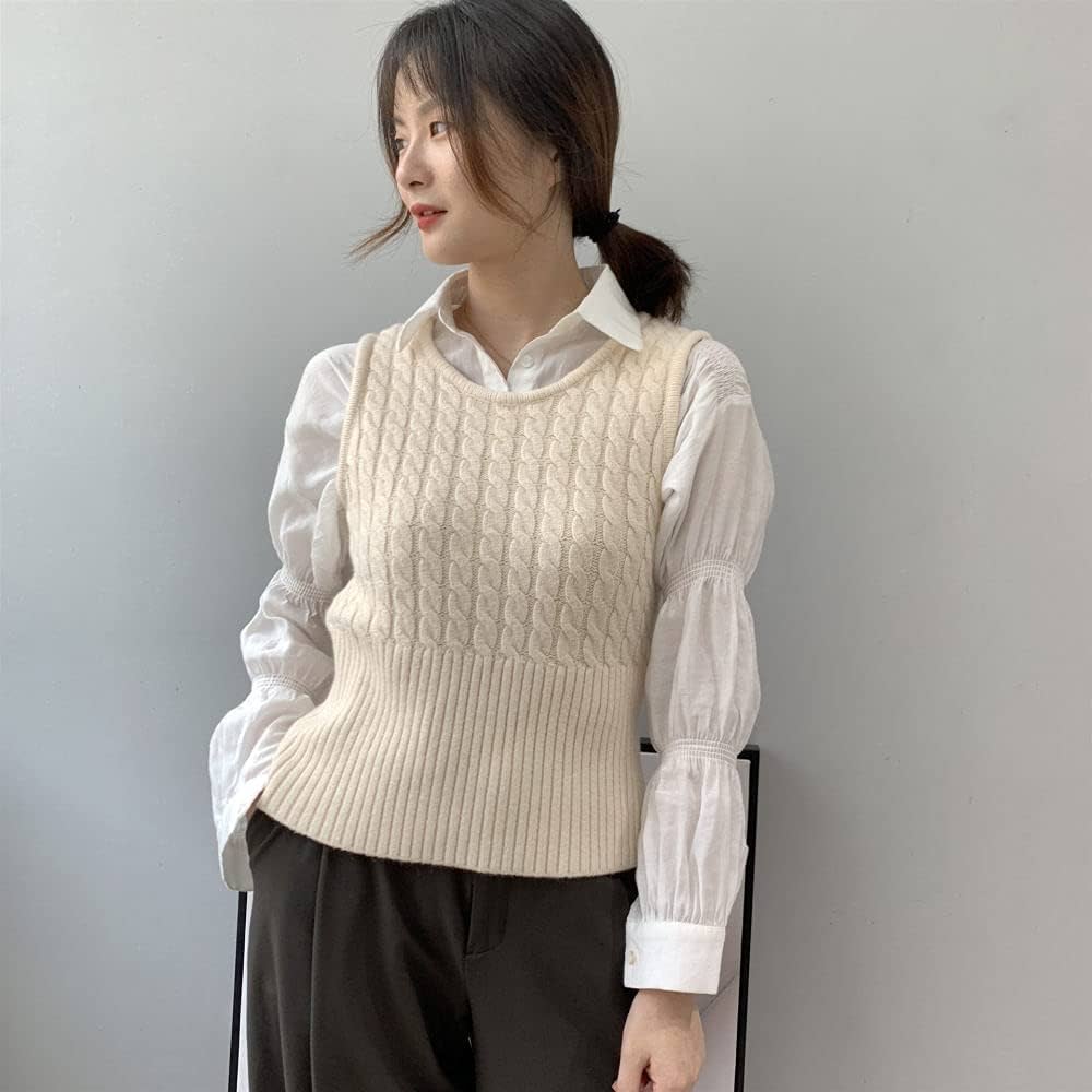 Pull sans Manche,Pull en Tricot pour Femme Mode Couleur Unie Câble en Tricot Large Ourlet Côtelé Col Rond Automne Hiver Épaissir Pull sans Manches …