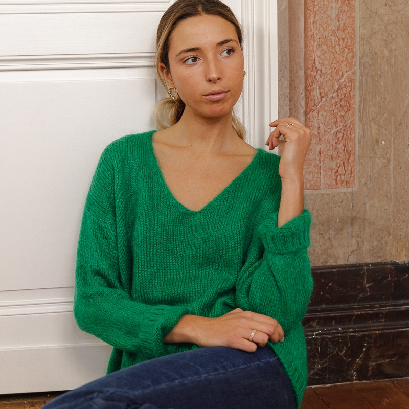 Pull col V en mohair, vert gazon Perrine & Antoinette